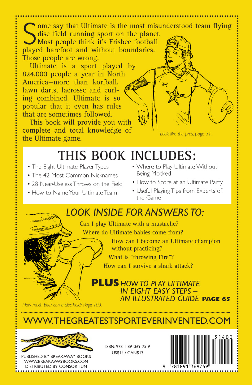 A: In December 2006 I was pitching a book featuring nice beautiful spreads of glorious national and international Ultimate tournaments – sort of a high-gloss picture book – called "50 Of the World's Best Ultimate Tournaments." A friend of mine introduced me to a literary agent and he said that my book pitch was intersting, but that Ultimate was too niche. He sent me to Breakaway Boooks. I pitched Breakaway and they didn't like it. I thought to myself, "Pasquale Anthony Leonardo, you just gots to come up with another pitch about Ultimate, son." So i grabbed the nearest book on my shelf that looked easy to write. It was called "The Hipster Handbook." So I said to myself, "I will pitch the 'Ultimate Frisbee Handbook' and model it on this here book." The pitch was accepted by Breakway in late January. I sketched out some chapters and ideas for the book but did nothing until the end of May. Then my editrix Jane and her friend Katie Derickson and I just riffed on stupid shit to write about Ultimate over the next 4 months. Voila!